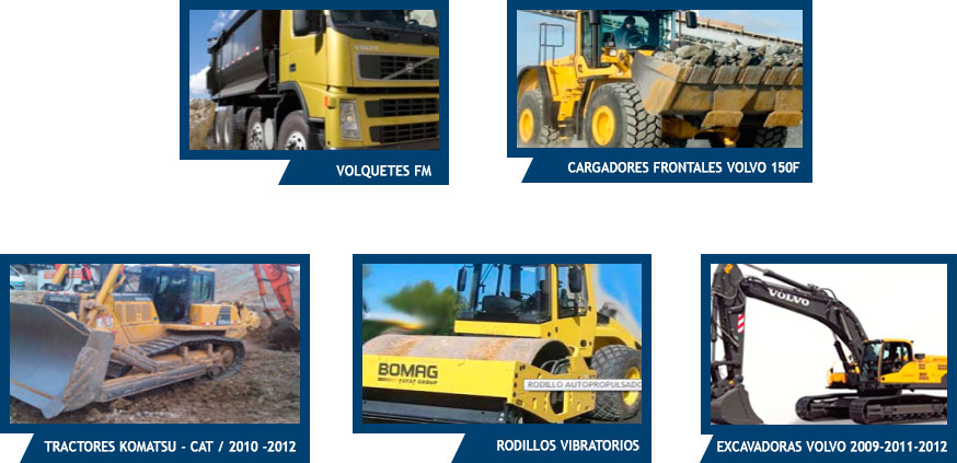 Otros: Tractores, Martillos, Hidráulicos, Retroexcavadoras, Cisterna de agua cama baja, Luminarias, Plantas de chancado.